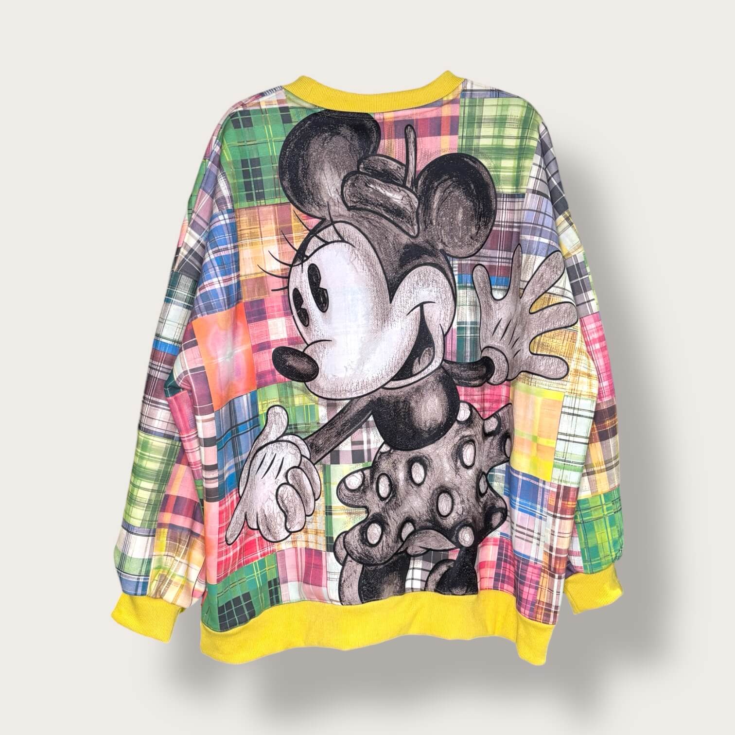 Bluza w stylu patchwork z dużym nadrukiem kultowych postaci Mickey i Minnie Mouse to prawdziwy hit dla miłośników mody z przymrużeniem oka i nutą nostalgii. Wykonana z miękkiego, przyjemnego w dotyku materiału, łączy w sobie wygodę casualowego kroju z wyjątkowo kolorowym i energicznym designem. Różnorodne kratki w intensywnych odcieniach tworzą patchworkowy wzór, który idealnie kontrastuje z czarno-białą grafiką zajmującą niemal całą część bluzy. Żółte ściągacze przy rękawach, dekolcie i u dołu dodają całości świeżości i optymistycznego charakteru. Ta bluza to nie tylko wygodny element codziennego stroju, ale też wyraz osobowości – idealna dla osób, które lubią bawić się modą i wyróżniać z tłumu.