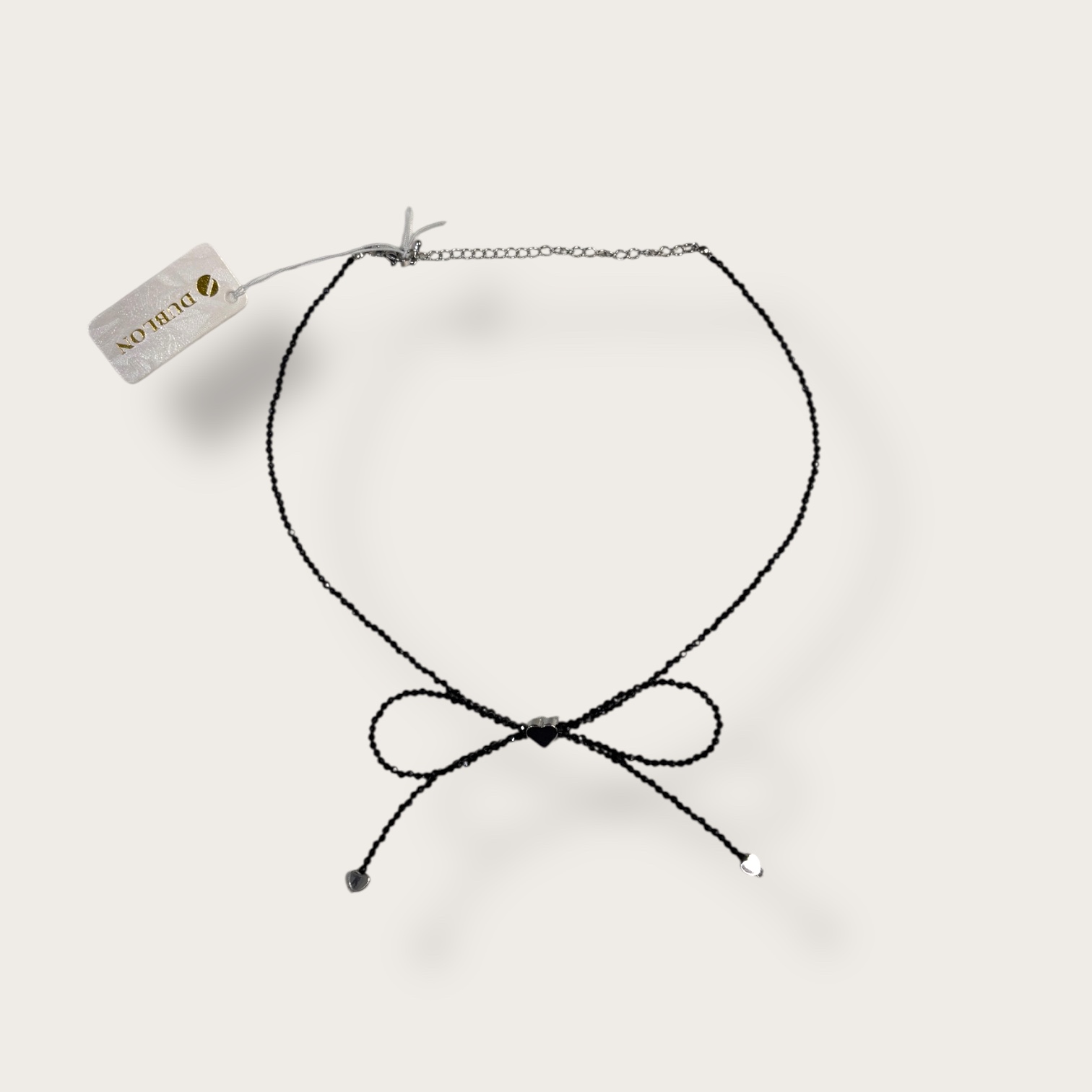 Ten subtelny naszyjnik z czarnych koralików zachwyca minimalistyczną formą oraz romantycznym akcentem w postaci delikatnej kokardki umieszczonej centralnie na linii dekoltu. Cienki sznur drobnych, połyskujących koralików miękko układa się wokół szyi, tworząc elegancką, lekką kompozycję. Finezyjnie uformowana kokarda nadaje całości dziewczęcego uroku i przyciąga spojrzenia, a niewielkie zawieszki w kształcie serduszek przy końcach ozdobnych sznurków dodają subtelnego blasku i wyrafinowanego detalu. Regulowane zapięcie umożliwia idealne dopasowanie długości, zapewniając komfort noszenia. To stylowy dodatek, który doskonale uzupełni zarówno codzienną stylizację z prostą bluzką, jak i elegancki zestaw wieczorowy, podkreślając indywidualny charakter i ponadczasową elegancję.