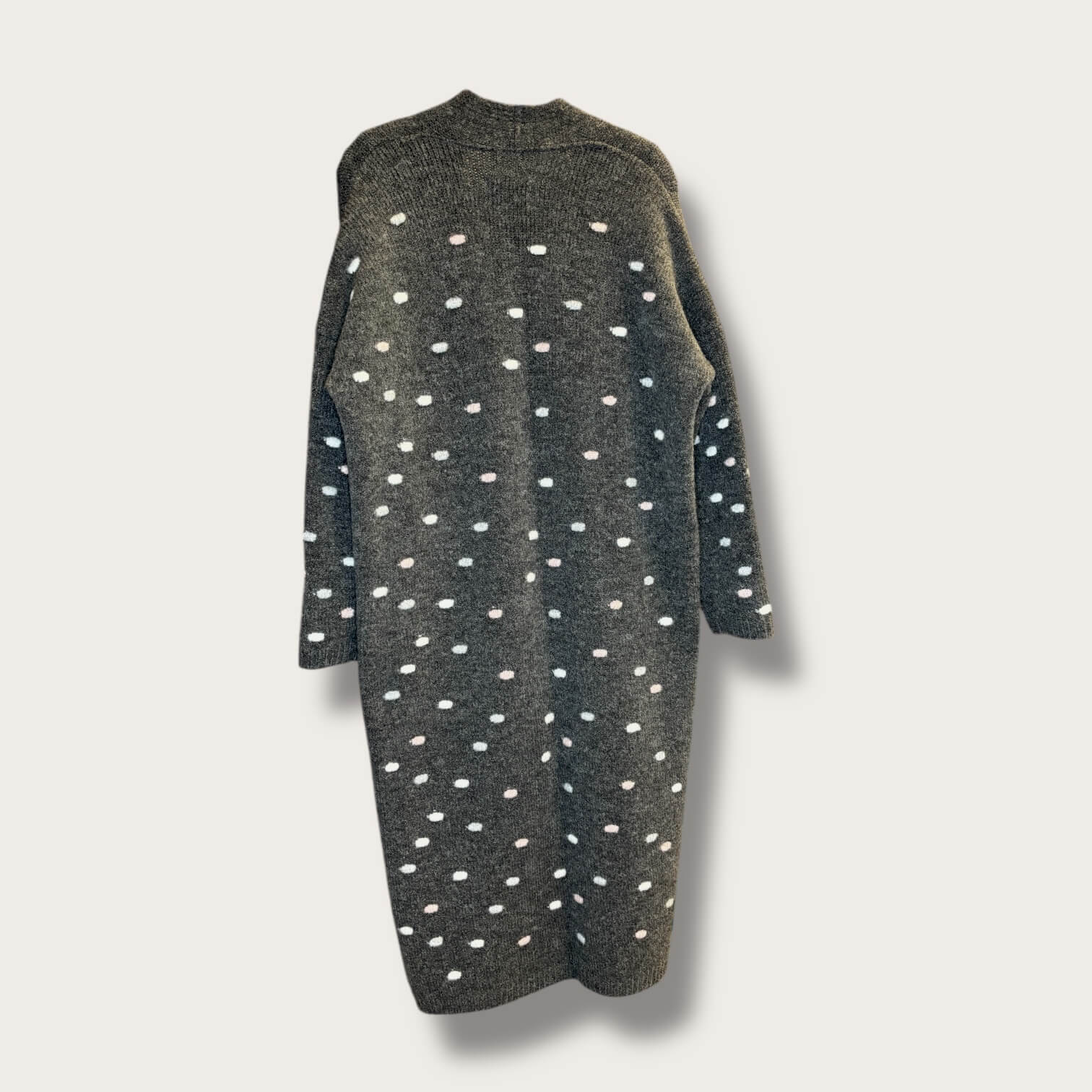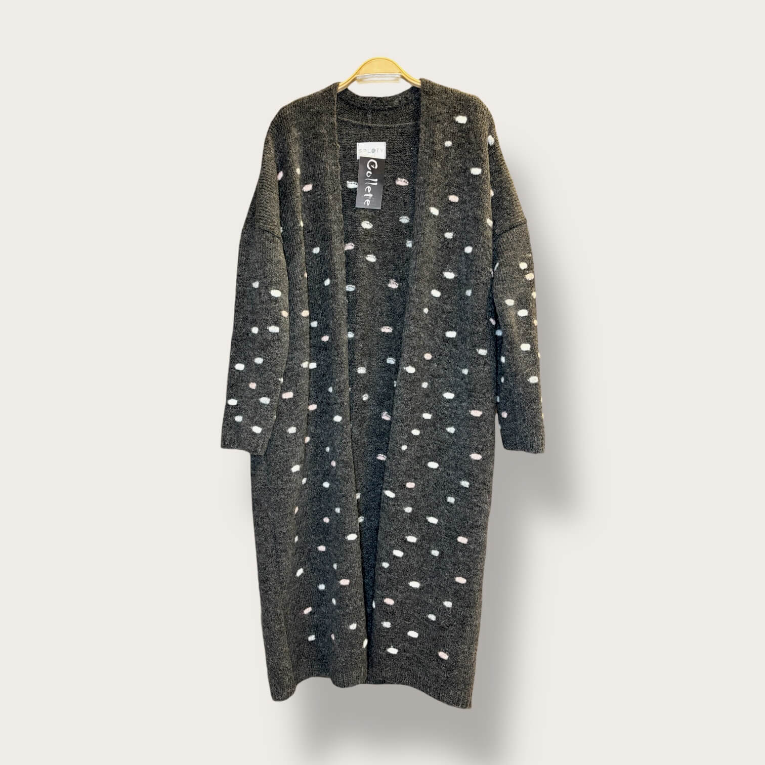 Długi, grafitowy kardigan w pastelowe kropki to stylowa i praktyczna warstwa odzieży, idealna na chłodniejsze dni. Wykonany z miękkiej i przyjemnej w dotyku dzianiny, zapewnia ciepło, nie rezygnując z lekkości i swobody noszenia. Luźny, otwarty krój bez zapięcia sprawia, że kardigan łatwo dopasować do różnych sylwetek i stylizacji – od casualowych po bardziej eleganckie. Drobny, kropkowany wzór w delikatnych odcieniach różu, błękitu i bieli dodaje uroku i kobiecego charakteru, nie przytłaczając całości. Długie rękawy oraz długość sięgająca niemal do połowy łydki czynią go idealnym do warstwowego ubioru. To uniwersalna propozycja dla osób ceniących wygodę, klasykę i subtelne detale.