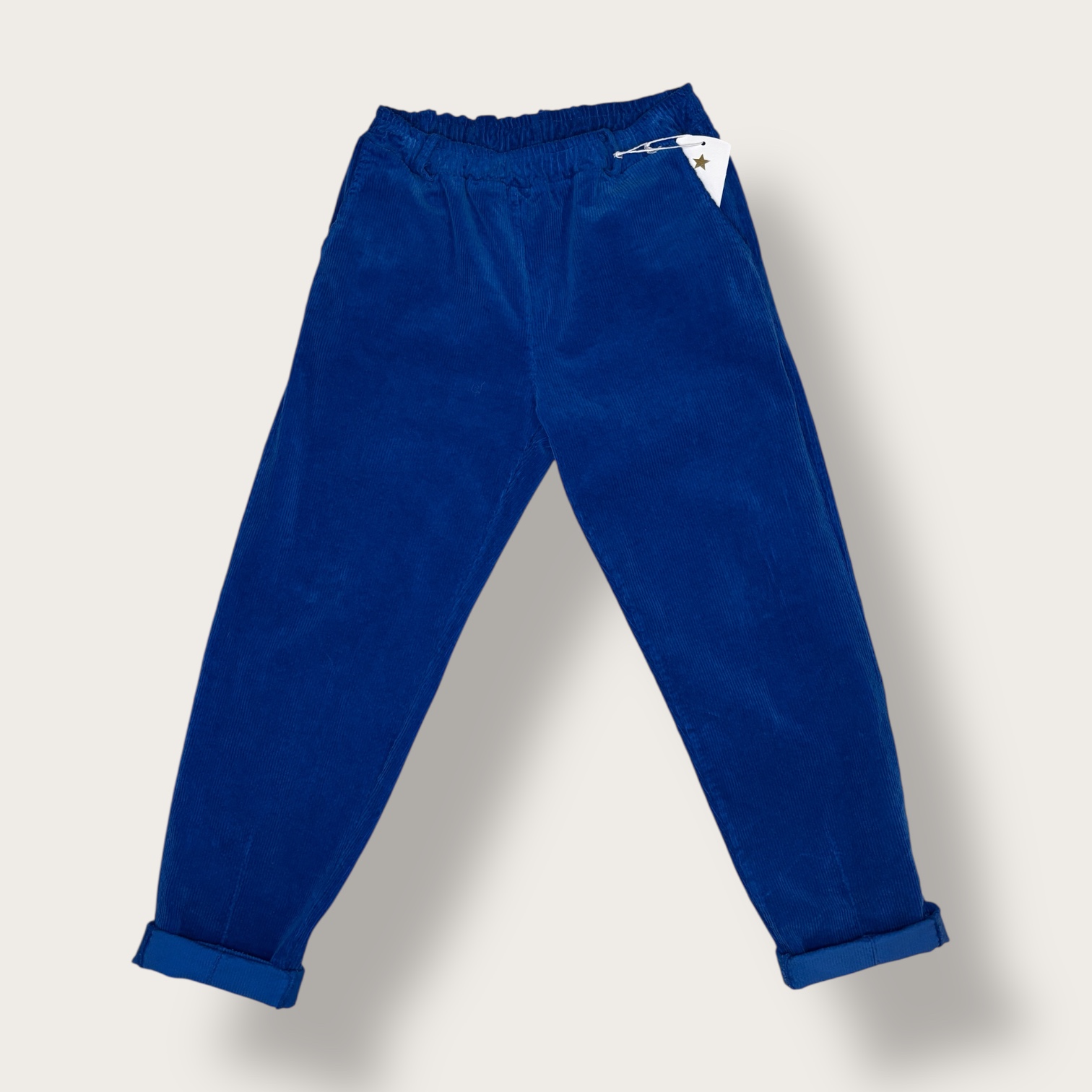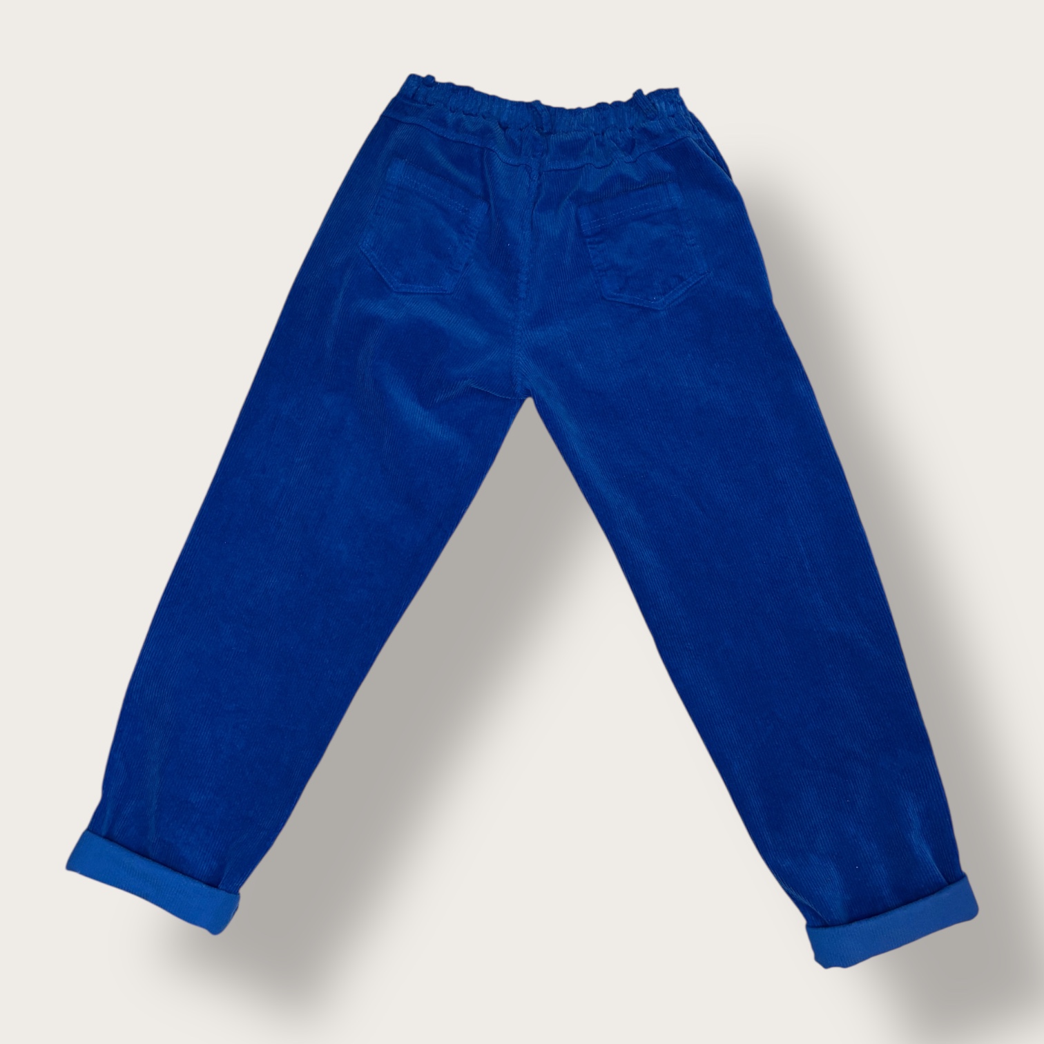 Te sztruksowe spodnie w głębokim, intensywnym odcieniu niebieskiego łączą w sobie wygodę i nowoczesny, swobodny styl. Wykonane z miękkiego, przyjemnego w dotyku materiału o wyraźnej prążkowanej strukturze, zapewniają komfort noszenia oraz trwałość na co dzień. Elastyczna talia delikatnie dopasowuje się do sylwetki, gwarantując wygodę i łatwość zakładania, a lekko zwężane nogawki zakończone podwinięciem nadają całości modowego charakteru. Minimalistyczny fason sprawia, że spodnie doskonale komponują się zarówno z klasycznym swetrem, jak i koszulą czy bluzą, tworząc stylizacje odpowiednie do szkoły, spaceru lub rodzinnych spotkań. To uniwersalny element garderoby, który wyróżnia się kolorem i funkcjonalnością.