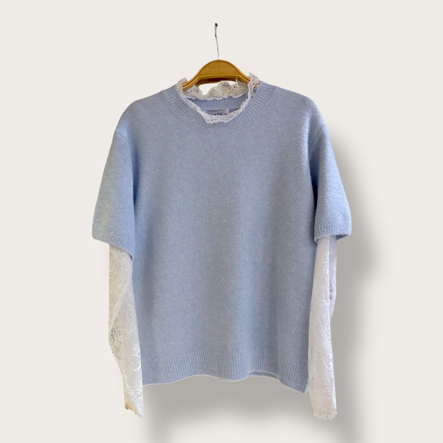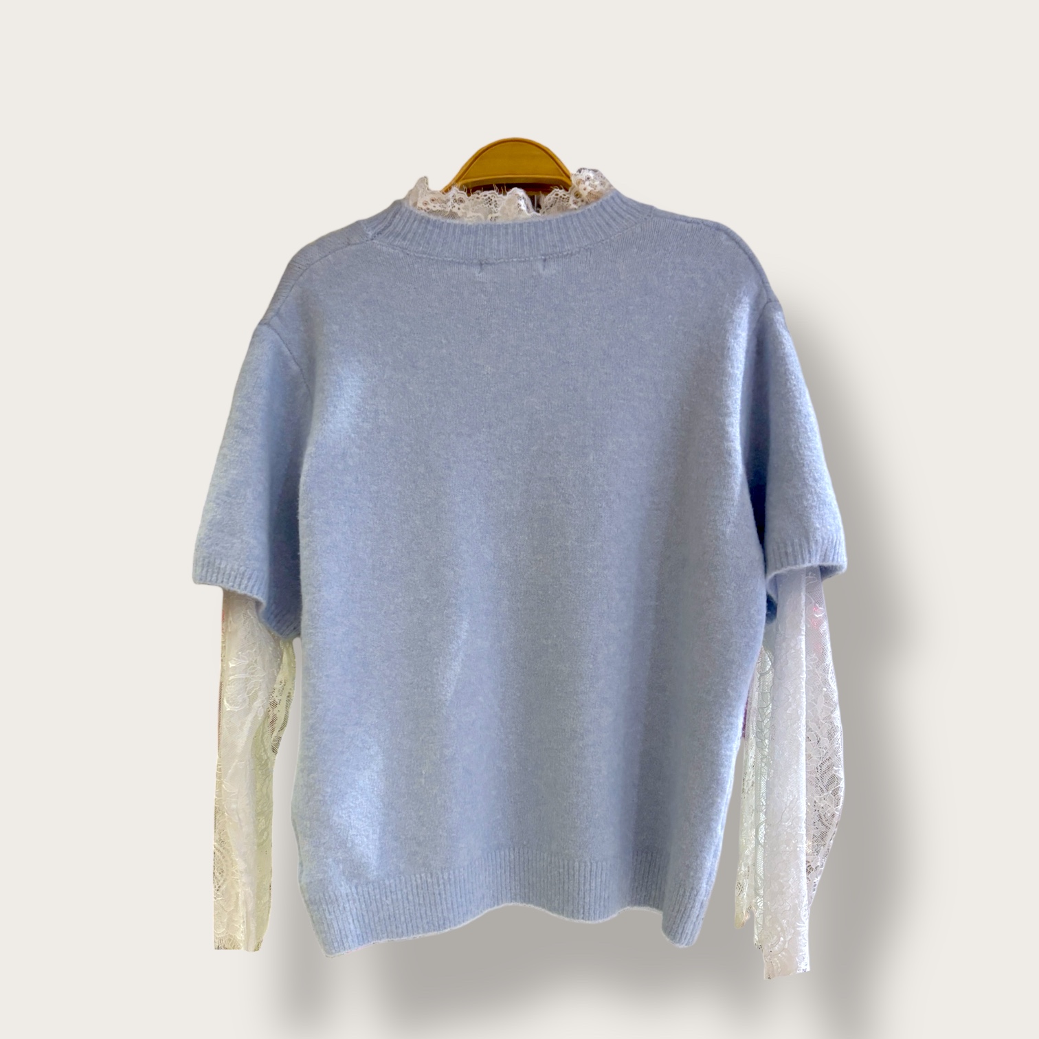 Sweter błękitny z białą koronką przy rękawach