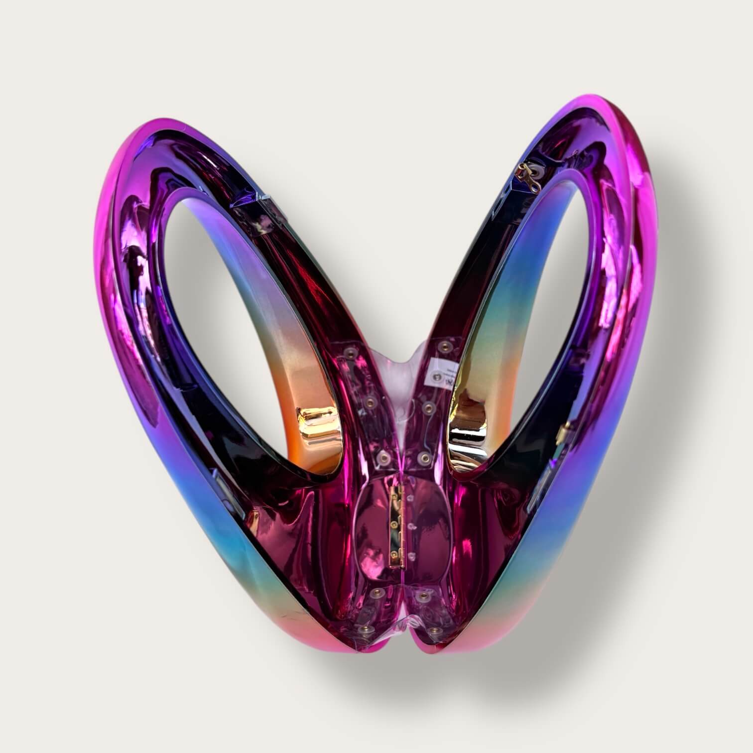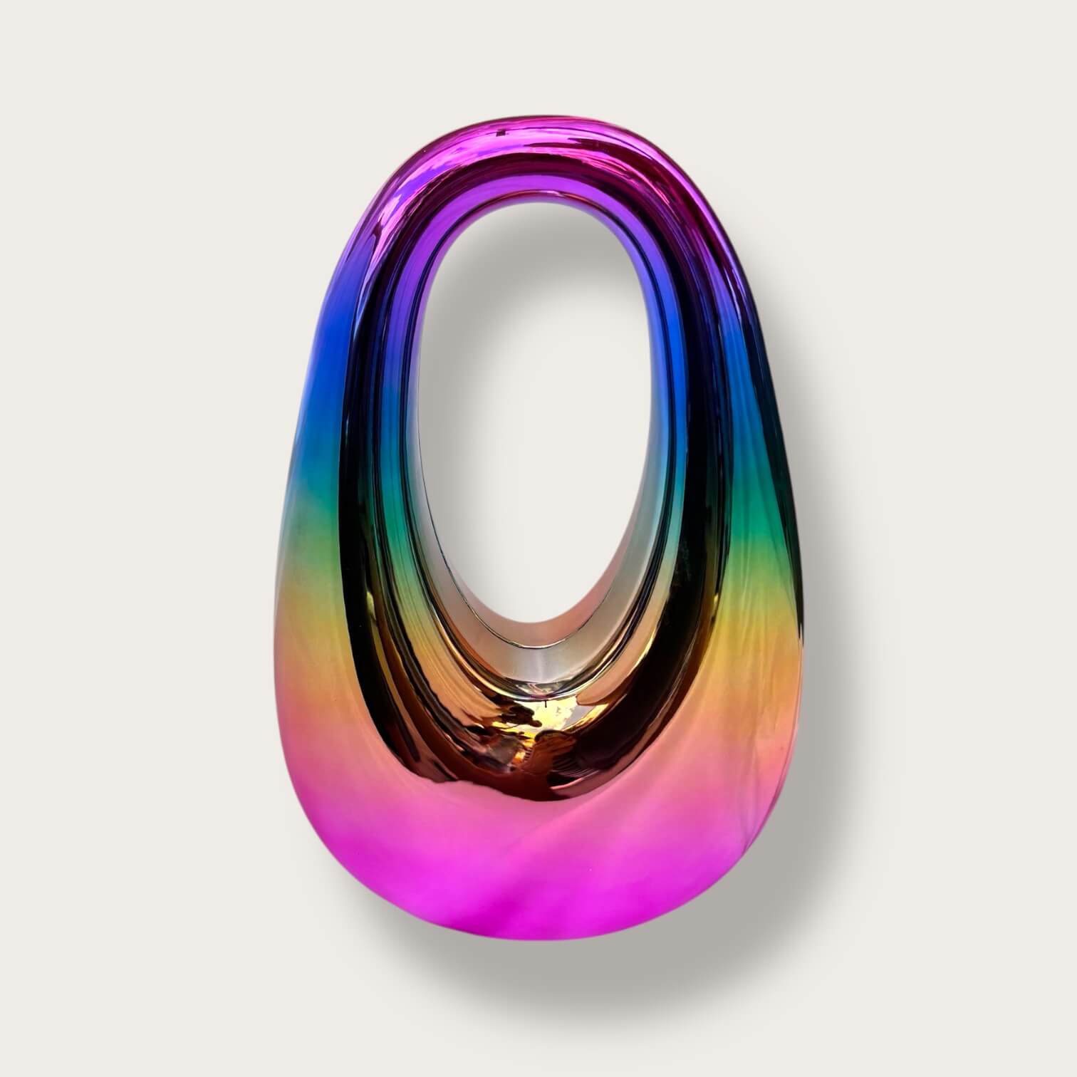 Torebka w futurystycznym kształcie o lustrzanej, wielobarwnej powierzchni to prawdziwe dzieło sztuki w świecie akcesoriów. Jej gładka, opływowa forma w odcieniach tęczy – od intensywnego fioletu, przez głęboki błękit, zieleń i złoto, aż po soczysty róż – tworzy efekt spektakularnego ombre, który mieni się przy każdym ruchu. Minimalistyczny, a jednocześnie odważny design sprawia, że torebka staje się centralnym punktem stylizacji, idealnym zarówno na wieczorne wyjścia, jak i modowe sesje zdjęciowe.